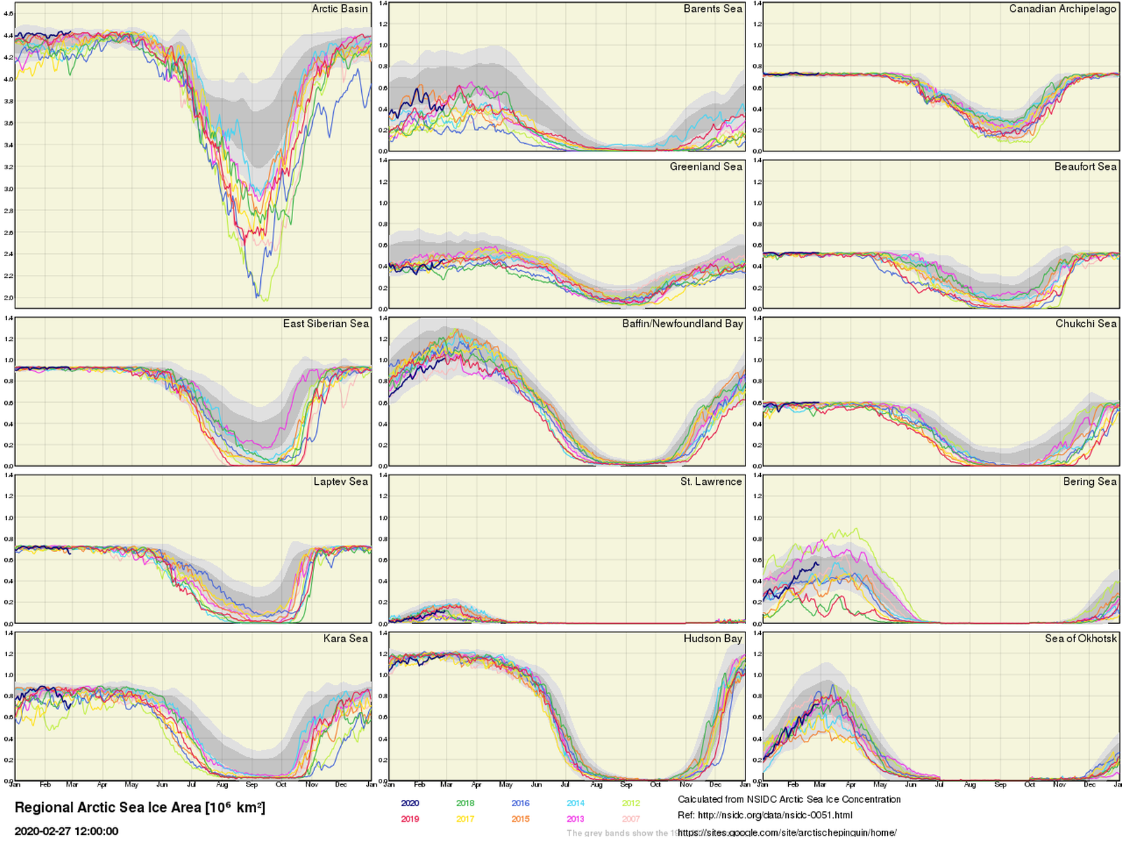Na koniec lutego zasięg arktycznego lodu morskiego osiągnął 14,87 mln km2, co jak na owe czasy jest sporą wartością. Czapa polarna na koniec lutego 2020 była o 0,63 mln km2 większa od rekordowej wartości z 2018 roku. Różnica względem średniej 1981-2010 była niewielka i wyniosła 0,66 mln km2, to jedynie 4,27%. Należy też zwrócić uwagę na fakt, że w 2012 roku zlodzenie o tej porze roku było podobne do obecnego. Mapa