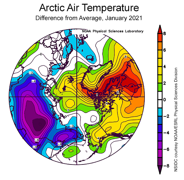 Styczeń 2021 różnił się od tych z lat 2016-2019. Pokrywa lodowa mimo, iż w dalszym ciągu miała mniejsze od średniej wieloletniej rozmiary, to nie znalazła się na podium. Arktyka nie była też tak ciepła jak w ostatnich latach jeśli chodzi o styczeń, duża była w tym rola północnej Syberii. Z kolei poprzedni rok na Ziemi był ex aequo najcieplejszym w historii pomiarów.
