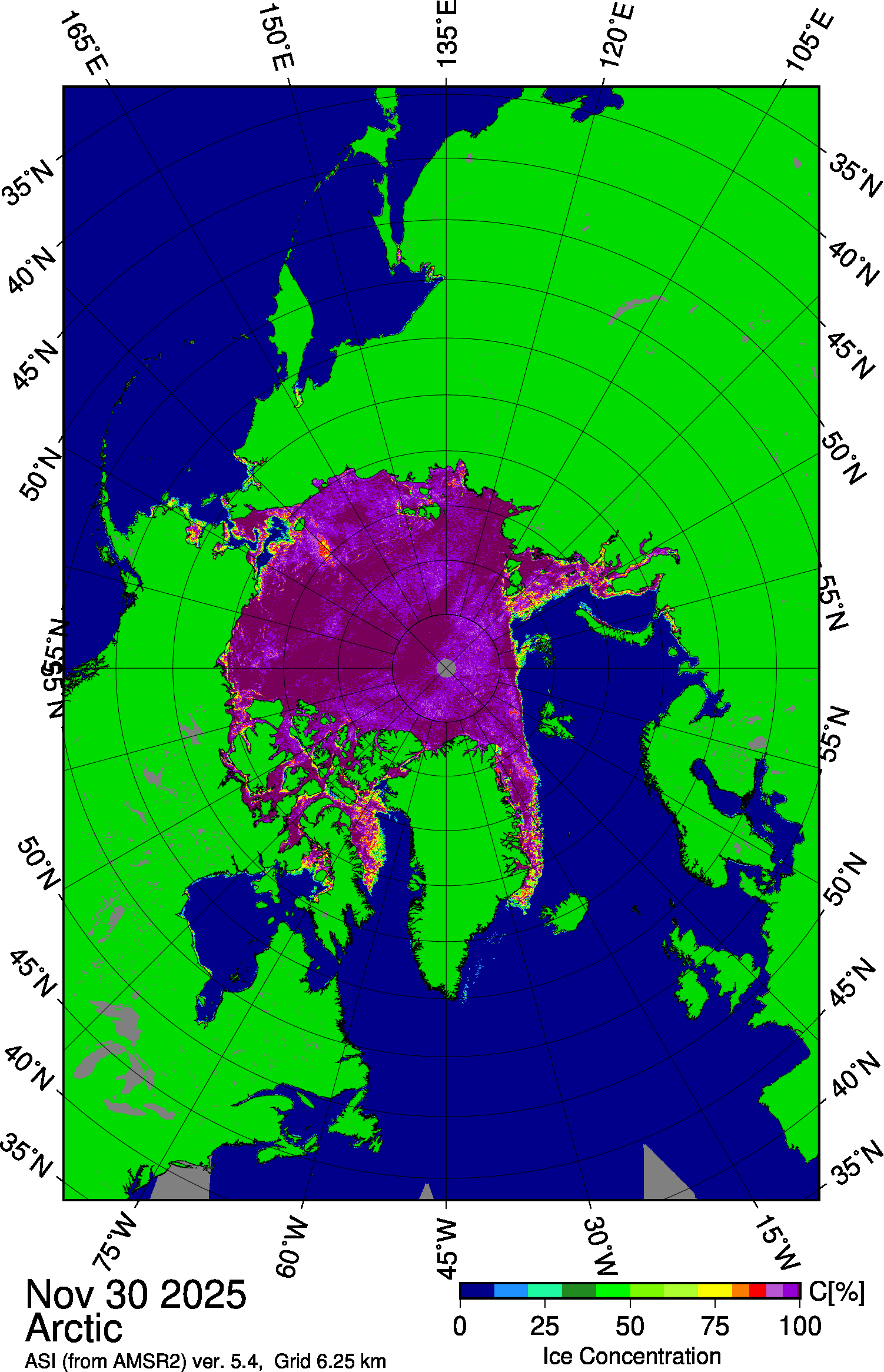 - Raport za I połowę listopada 2025 - coraz bliżej nowego rekordu w Arktyce, 16 listopada 2025 Chociaż warunki atmosferyczne sprzyjające zamarzaniu arktycznych wód uległy poprawie, to nadal wyższe niż zwykle temperatury hamowały ten proces. Niektóre obszary zamarzają bardzo wolno, a nawet w ogóle nie rozpoczynają zamarzania.